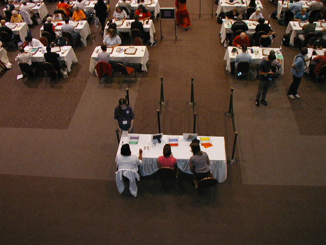 Go to: Commentary Games Players Photos Profiles Standings Press Merchandise Back to NSC 2002 Photos Round 15 NSC 2002 Photo 15-013Congratulations to our new National Champion, Joel Sherman! See also: video clip 1 (2 MB), video clip 2 (2 MB). (video courtesy Roger Cullman) Interns at the table where all event slips are returned. Photo taken from the balcony above. |