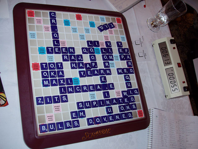 Go to: Commentary Games Players Photos Profiles Standings Press Merchandise Back to 2003 Canadian SCRABBLE Championship Photos: Round 6 2003 Canadian SCRABBLE Championship Photo 06-002David Boys (Dorval QC) vs. Robin Pollock Daniel (Toronto ON). |