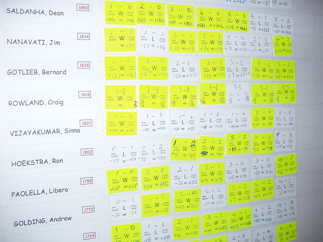 Go to: Commentary Games Players Photos Profiles Standings Press Merchandise Back to 2003 Canadian SCRABBLE Championship Photos: Round 8 2003 Canadian SCRABBLE Championship Photo 08-002A closeup of the stickers, yellow for wins and white for losses. |
