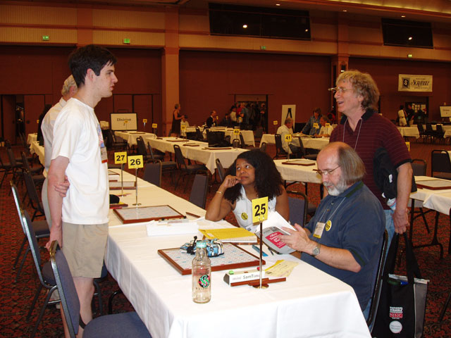 Go to: Commentary Games Players Photos Standings Press Merchandise Back to 2005 National SCRABBLE® Championship Photos: Round 7 2005 National SCRABBLE® Championship Photo 08-016[ ] End of the day ruminations: Joey Mallick (Cape Elizabeth, ME), Lisa Odom (St. Louis Park, MN), Paul Avrin (New York, NY) and Steve Pellinen (St. Louis Park, MN). |