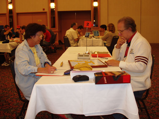Go to: Commentary Games Players Photos Standings Press Merchandise Back to 2005 National SCRABBLE® Championship Photos: Round 14 2005 National SCRABBLE® Championship Photo 15-003[ ] Table 2 in division 1 action: Carol Kaplan (San Diego, CA) vs. Joe Edley (Coram, NY). At table 1 in the distance, Nathan Benedict (Tucson, AZ) plays Panupol Sujjayakorn (Thailand) at the annotated board this round. |