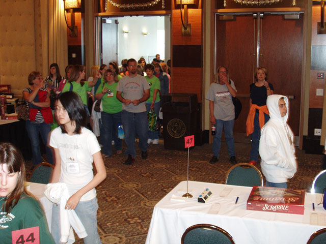 Players and coaches pass the Media Table on their way into the playing room.