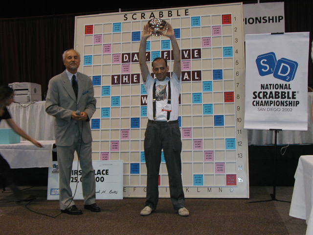 Go to: Commentary Games Players Photos Profiles Standings Press Merchandise Back to NSC 2002 Photos Round 32 NSC 2002 Photo 32-042Congratulations to our new National Champion, Joel Sherman! See also: video clip 1 (2 MB), video clip 2 (2 MB). (video courtesy Roger Cullman) Joel Sherman (Bronx, NY) raises his cup high overhead. |